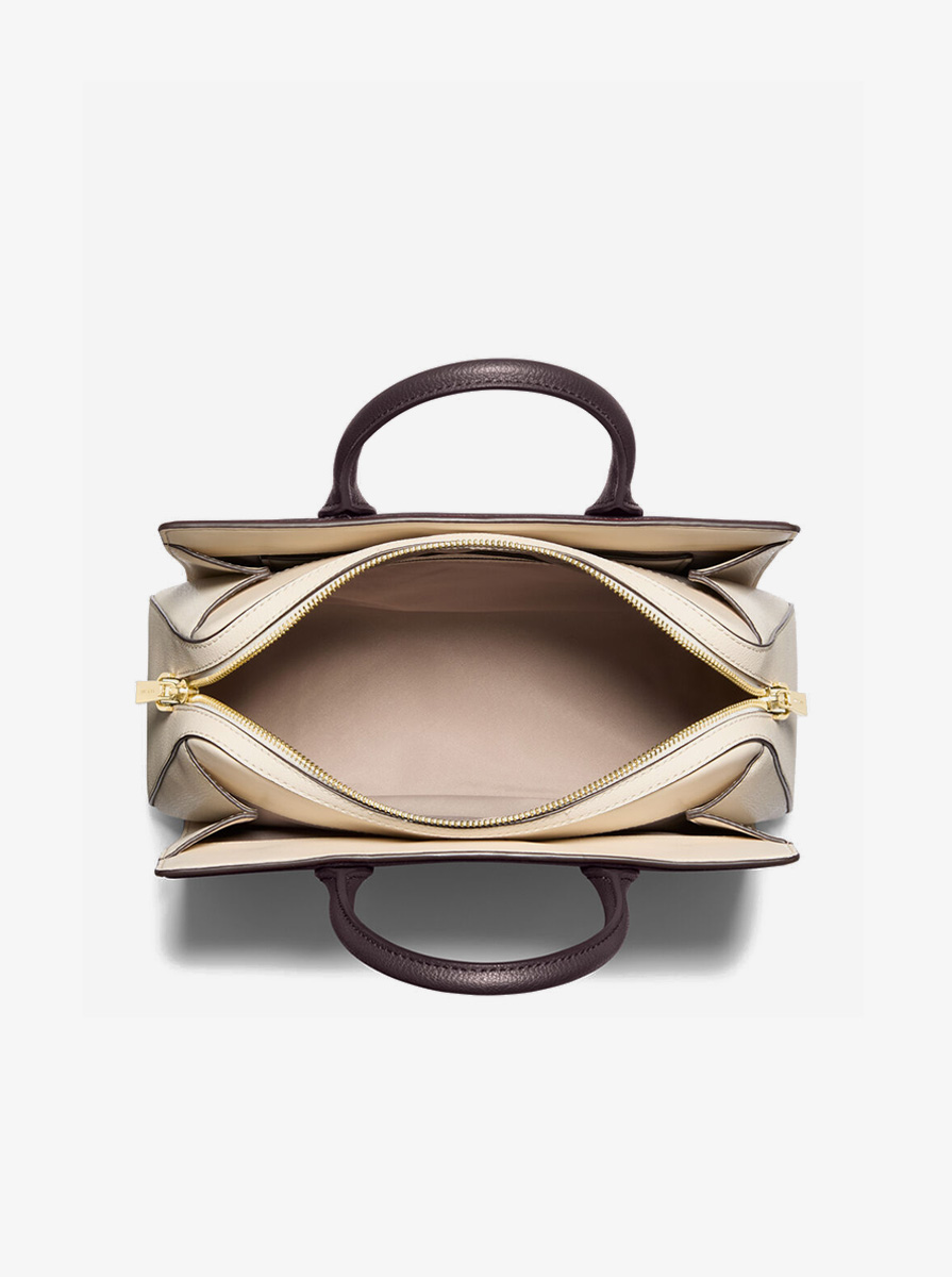 “The Laila satchel is made to take you from dawn to dusk with ease. Crafted in a structured silhouette from color-block leather, it opens to a medium-sized interior designed to hold your daily essentials. Adjust the crossbody shoulder strap for the perfect fit.”